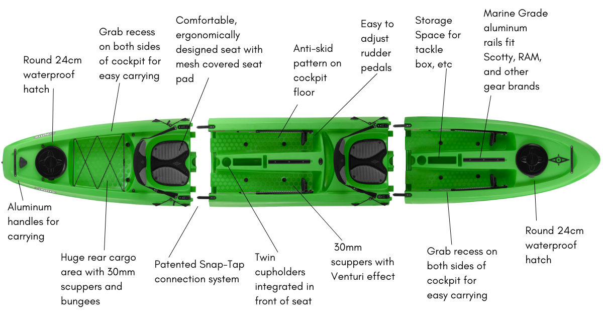 *Recommended weight of paddler: max 200lb person for footwells staying dry - water still drains from scupper plugs but there will be some water splashing in footwells a bit if you exceed this. Not recommended for persons greater than 225lbs